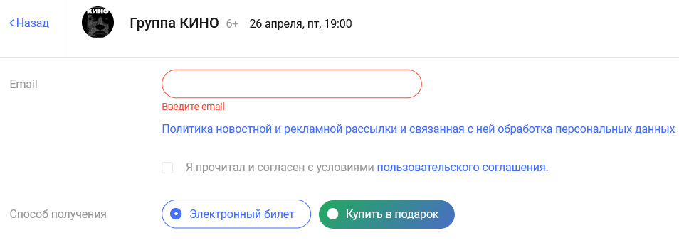 Билеты, открытка и поздравления придут по указанному email-адресу получателя. Электронный чек автоматически отправится покупателю.