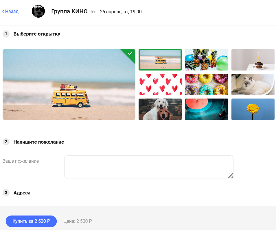 Теперь начинается самое интересное! На следующем шаге Вы можете выбрать одну из милых открыток, которая придет получателю вместе с электронными бланками билетов, а также написать индивидуальное пожелание в Ярославле.